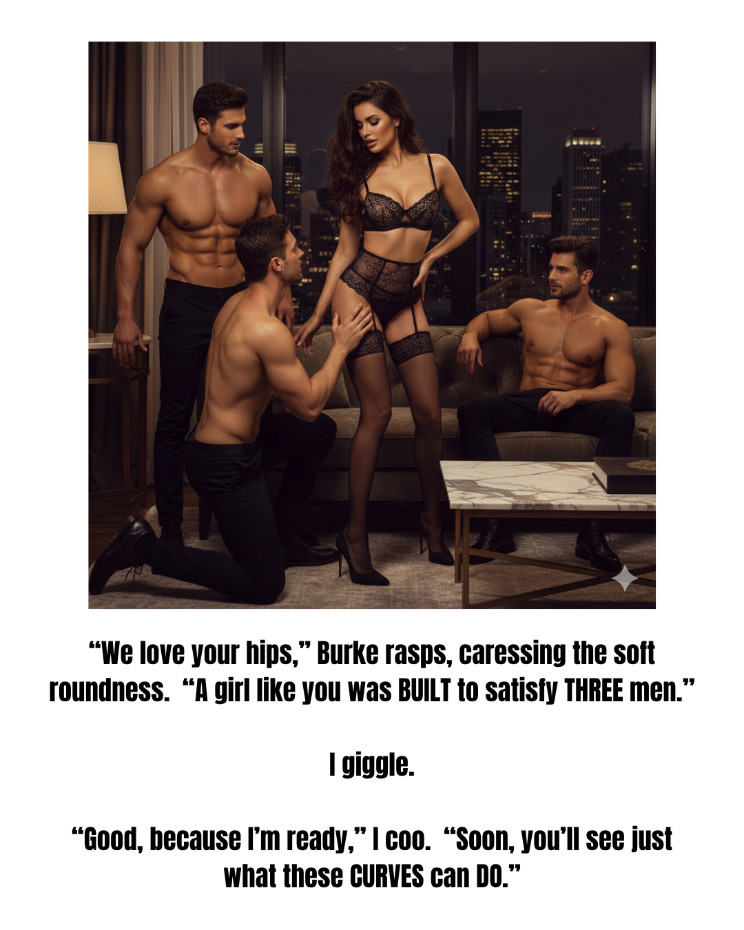 Burke: My buddies and I are a$$holes, there’s no question about it. We made a bet to see whose secretary is the hottest, and it was my Jess who won. As a result, the three of us claimed her together. Again and again, until the curvy girl cried out with pleasure. But this isn’t a game anymore. After all, party toys are for sharing … but what happens now that Jess is pregnant with our triplets?